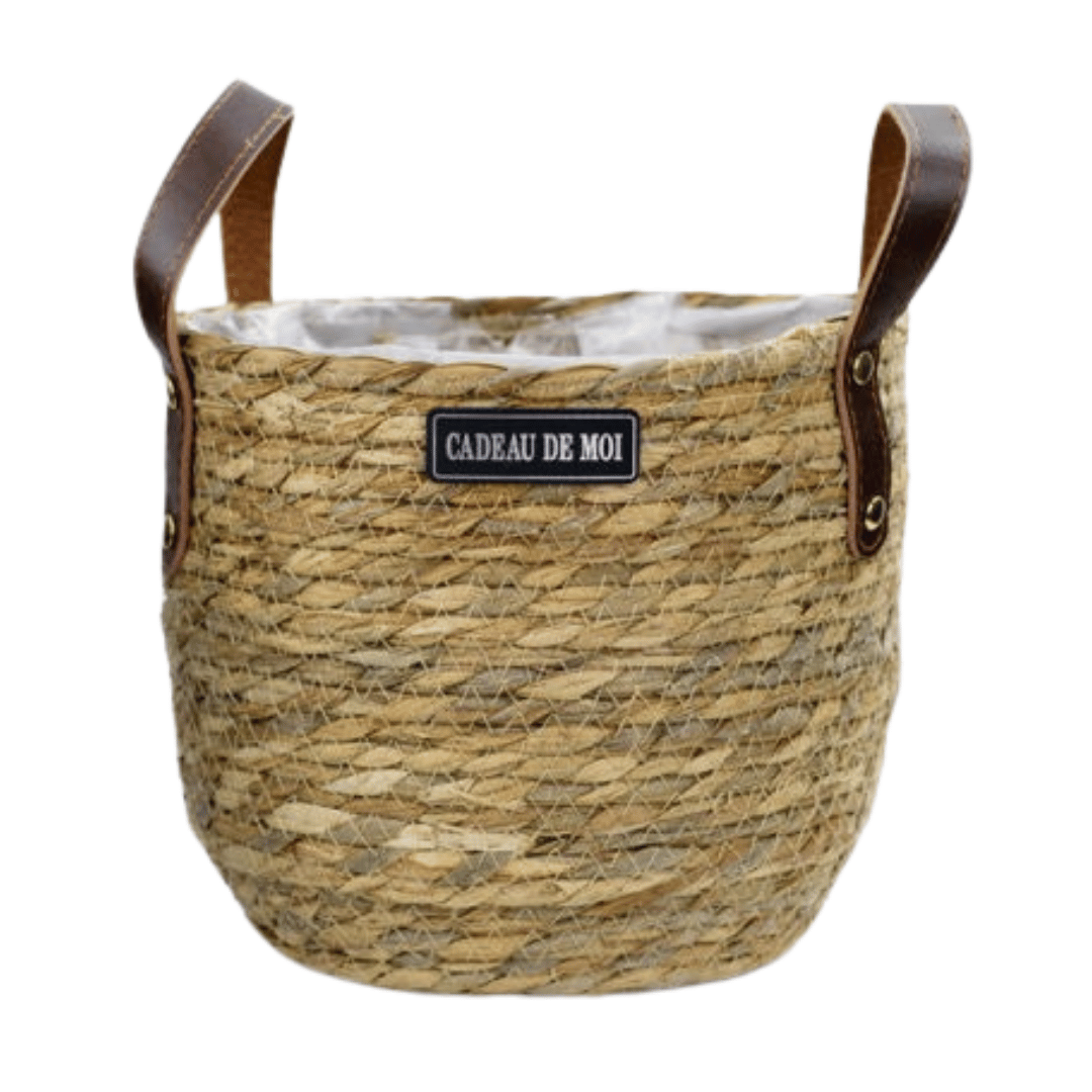 Baskets in natural color with hard braid, leather handles and transparent pvc (Water Resistance) suitable for plants